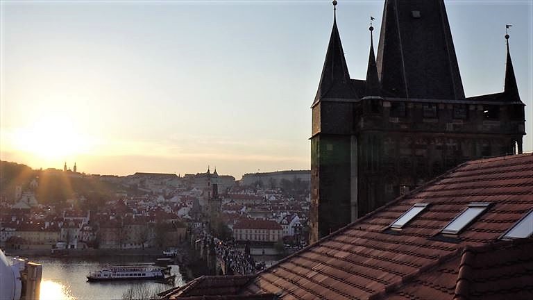テラスから眺める夕暮れのカレル橋。